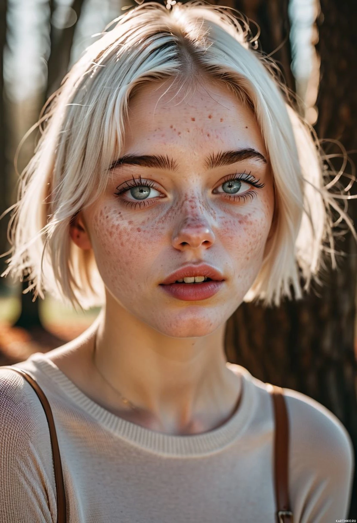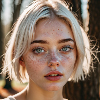 a wooded area with trees providing a natural backdrop to the portrait. The woman's attire suggests