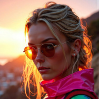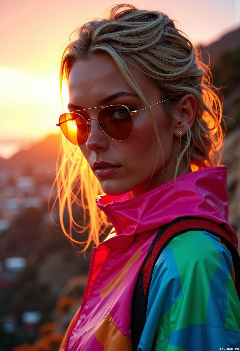 a young woman with blonde hair, wearing sunglasses and a vibrant jacket. The woman's long, wavy