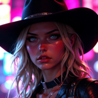 neon lights reflecting off her face and body. The woman's facial features are striking, with piercing