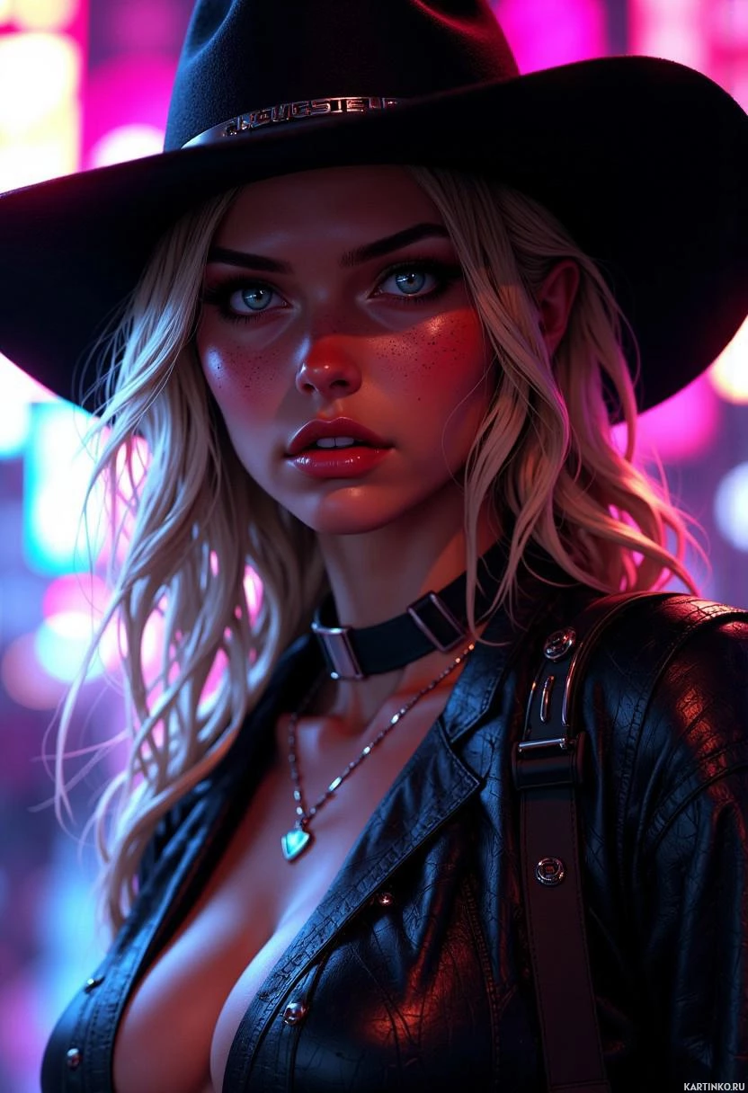 silver necklace around her neck. Her hair is long and wavy, cascading down her back like a golden waterfall. It is styled in loose waves, framing her face and accentuating her cheekbones. The hat she wears adds a touch of sophistication to her overall look, casting a shadow over her eyes and adding depth to her features. The black leather jacket is fitted closely to her body, showcasing her toned physique. It has silver buckles on the shoulders and a collar that frames her face. The jacket is open at the front, revealing a glimpse of her white shirt underneath. In terms of accessories, the woman wears a delicate silver necklace around her neck, featuring a small pendant that catches the light. Her ears are adorned with small earrings, adding a touch of elegance to her overall look. Overall, the image presents a striking portrait of a young woman who exudes confidence and poise. Her features are sharp and defined, and she carries herself with grace and sophistication. The blurred background adds a sense of mystery to the image, leaving the viewer to wonder about the context in which this photo was taken.