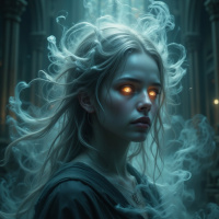 a body of water. The smoke around her takes on a wispy, ethereal quality, suggesting that it may be magical in nature. It swirls around her head and shoulders, creating