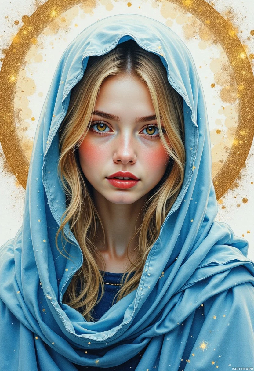 a young woman with long blonde hair, wearing a blue hooded garment that covers her head and shoulders. The hood is pulled up over her head, creating