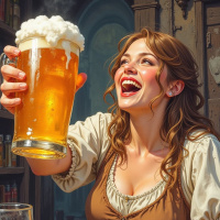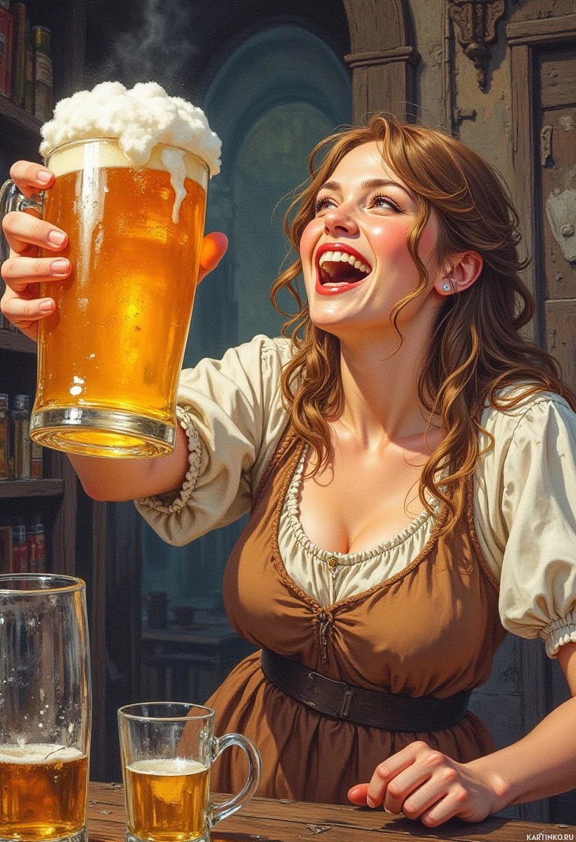 red hair and a bright smile, holding up a large mug filled with beer. She is wearing