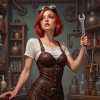 confident expression and focused demeanor convey a sense of competence and skill in her chosen field. In terms of visual details, the image features a range of textures and colors, including the smooth leather of the corset, the roughness of the wrench's handle, and