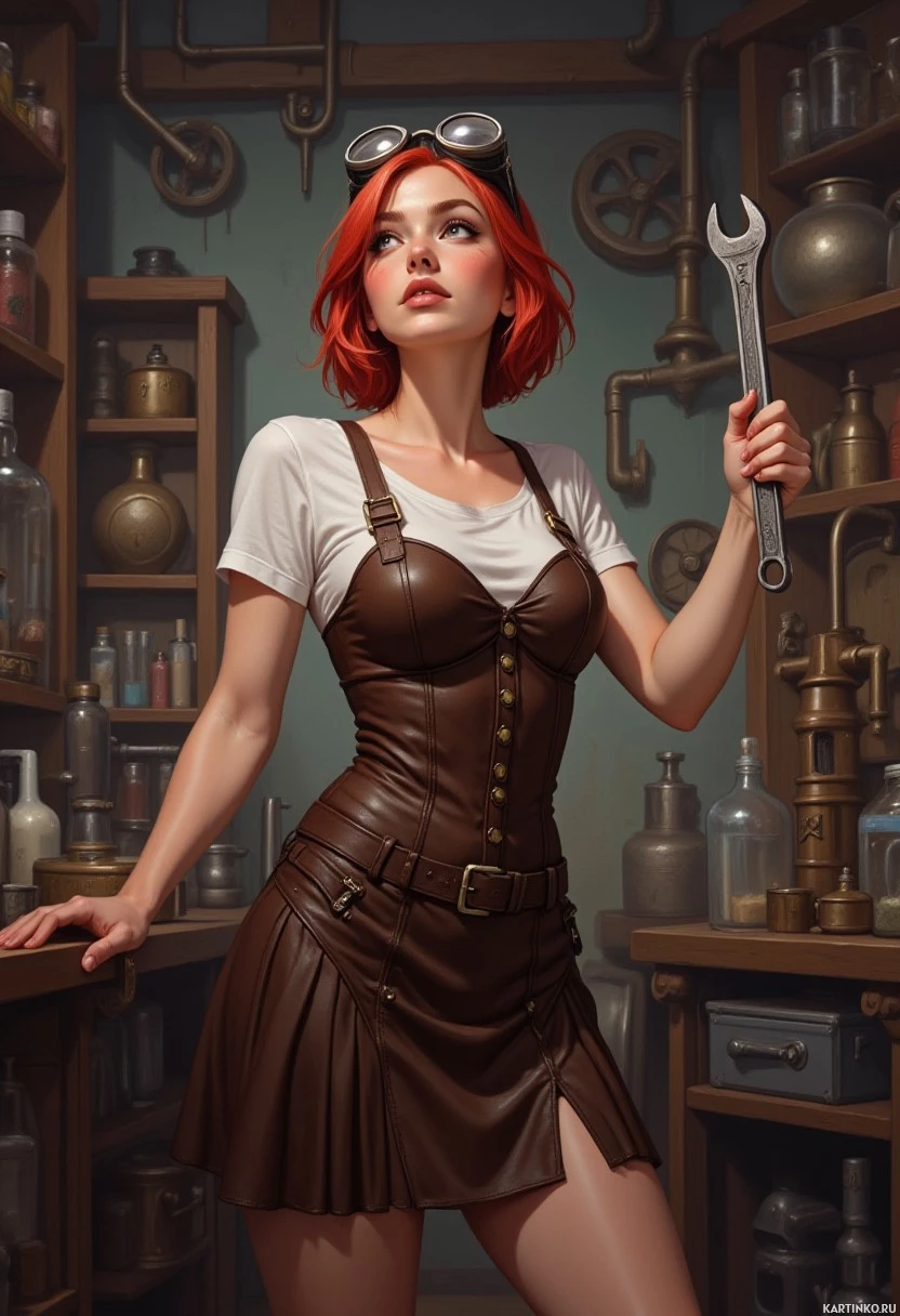 a young woman with striking red hair, dressed in a white t-shirt and brown leather corset-style top. She is holding a large wrench in her right hand, which has a long handle and a curved end. The background of the image appears to be a workshop or garage, with