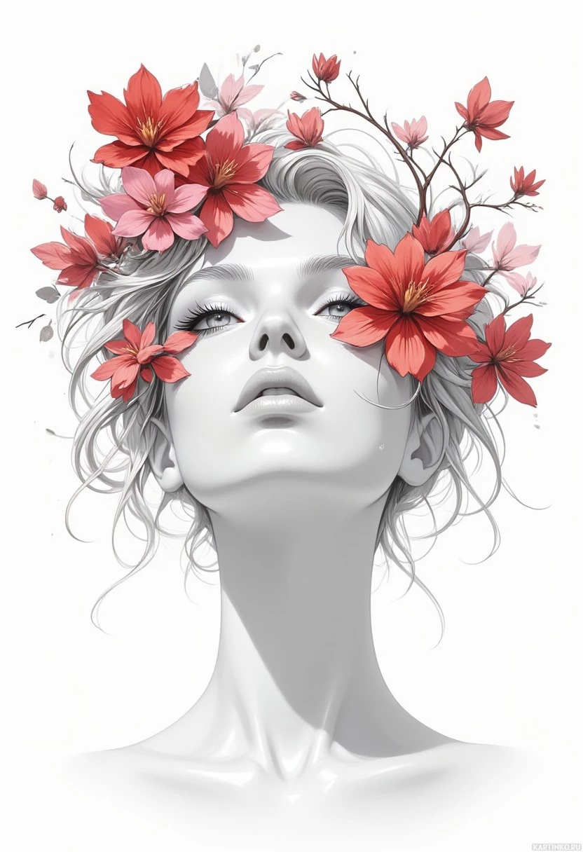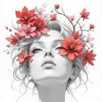 a striking contrast with the vibrant flowers. * **Pink and Red:** The pink and red hues of the flowers add a touch of warmth and vibrancy to the illustration. **Composition:** * **Central Figure:** The woman's head occupies the center of the image, drawing the viewer's attention. * **Background:** The background is plain white, allowing the subject to take center stage. **Style:** * **Illustration:** The image is an illustration, characterized by its detailed and stylized representation of the subject. * **Realism:** While the style is illustrative, it also incorporates elements of realism, capturing the subtleties of human expression and emotion. Overall, the image presents a captivating and serene portrait of a woman, adorned with vibrant flowers that add a touch of color and vibrancy to the illustration.