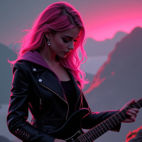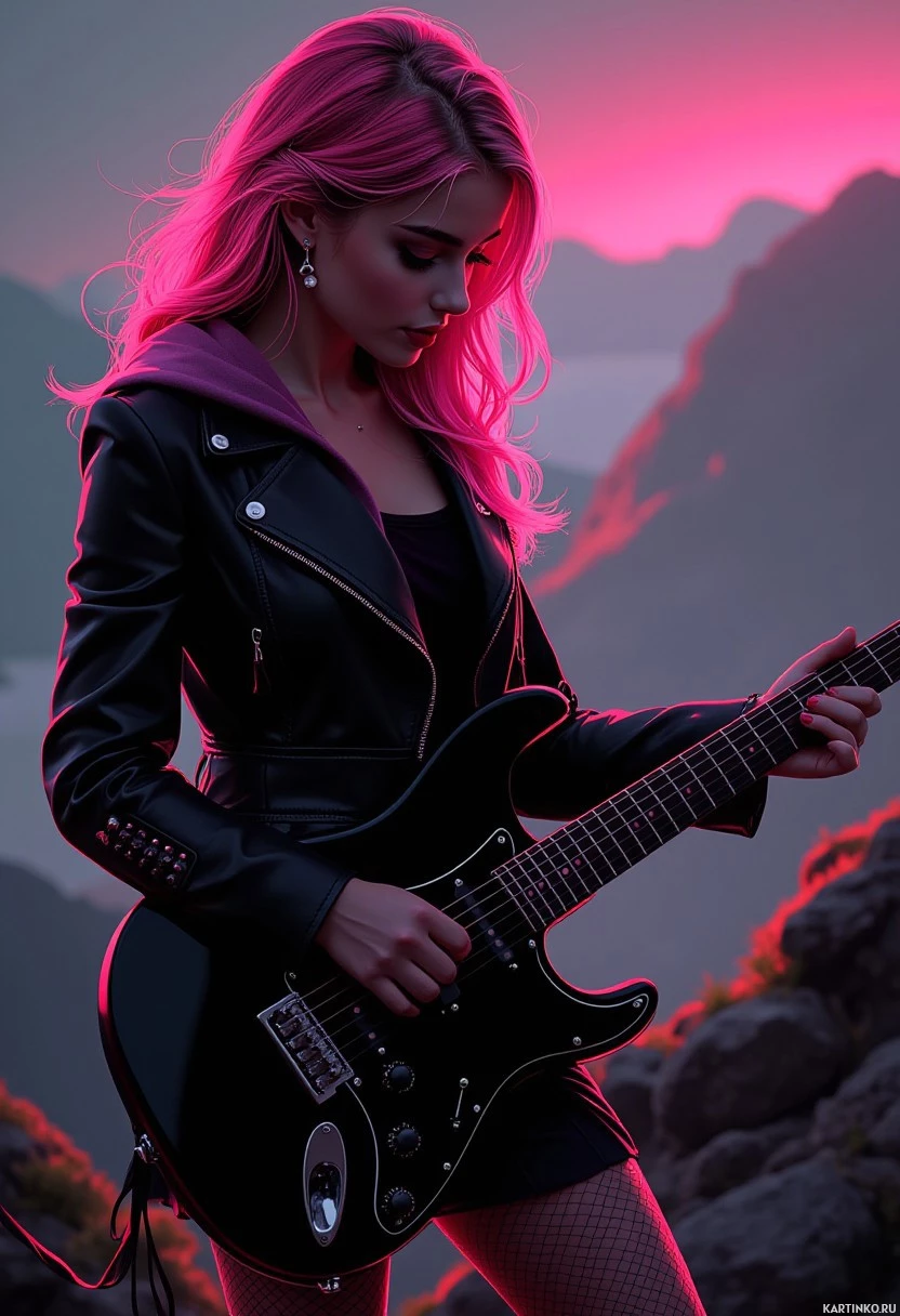pink hair, dressed in a black leather jacket and shorts, playing an electric guitar. She has her eyes closed as she plays, suggesting that she is fully immersed in the music. The woman's pink hair is styled in