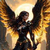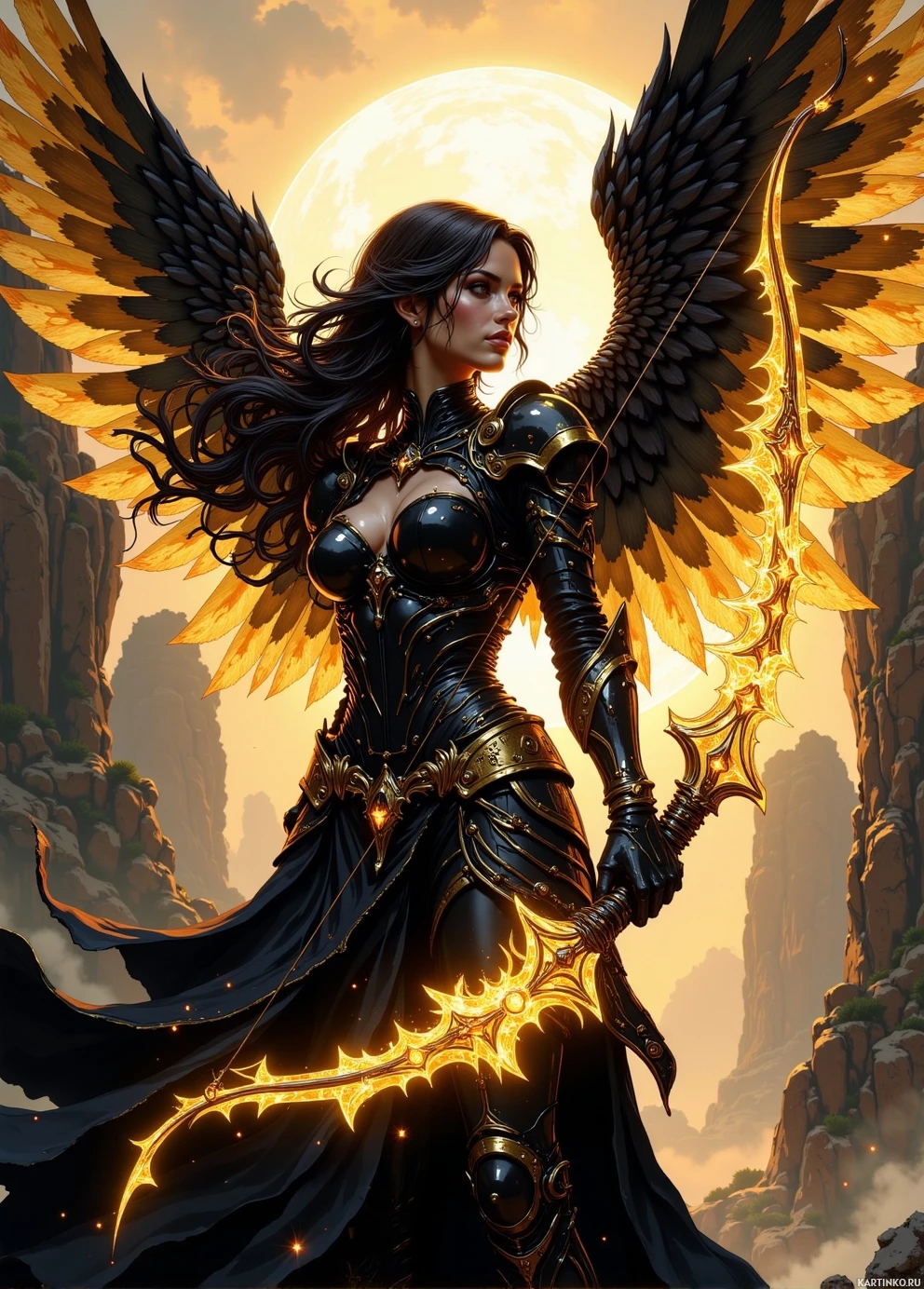 a simple design. * It is held at a 45-degree angle, with the string taut and the arrow pointing upwards. * The woman's grip on the bow is firm but not overly tense, suggesting that she is confident in her ability to use it effectively. * Her wings are large and feathered, with a dark color that matches her hair. * They are spread wide behind her, adding to her overall size and presence. * The feathers appear to be soft and fluffy, rather than stiff or rigid. * The woman's wings do not seem to be attached to her body in any way, but instead appear to be floating freely behind her. * In the background of the image, there are rocky cliffs rising up into the sky. * The cliffs are rugged and uneven, with jagged edges and steep drop-offs. * They appear to be made of a dark-colored rock or stone, which contrasts with the lighter colors of the woman's armor and wings. * The cliffs are covered in sparse vegetation, including small bushes and trees that cling to the rocky surfaces. Overall, the image presents a powerful and majestic figure, who is both beautiful and intimidating. Her armor and bow suggest that she is a warrior or hunter, while her wings add an element of fantasy and wonder to the scene. The rocky cliffs in the background provide a dramatic backdrop for the woman's pose, emphasizing her strength and agility.