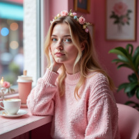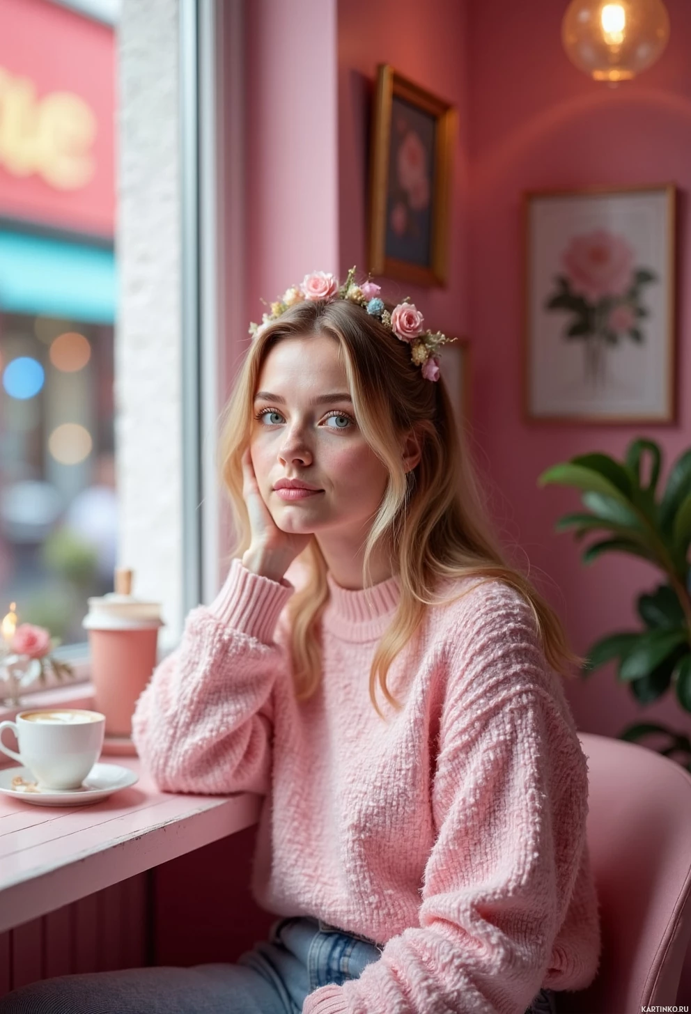 a young woman with long blonde hair, wearing a pink sweater and a floral crown on her head. She is seated at a table in front of a window, holding her hand to the side of her face. On the table, there are two white