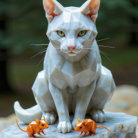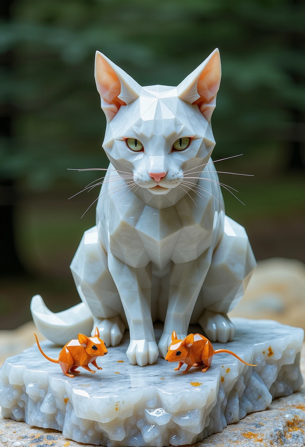green eyes, while the mice are crafted from a shiny material resembling gold. * **Cat Statue** * Color: White * Material: Marble or Stone * Eyes: Green * Position: Sitting on a rock in front of two mouse statues * **Mouse Statues** * Color: Orange * Material: Shiny material resembling gold * Position: In front of the cat statue, facing it The overall scene is set against a blurred background, which appears to be