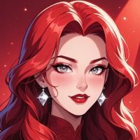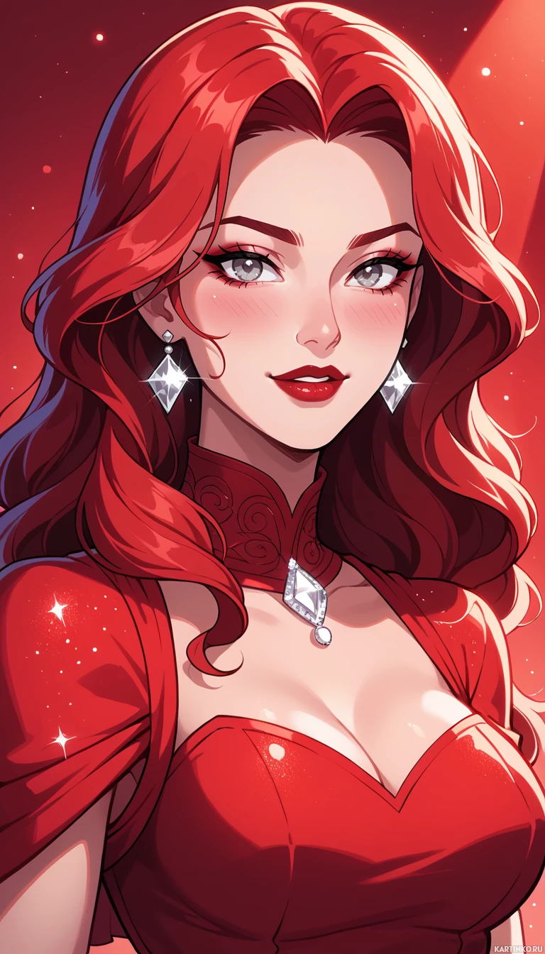 thick eyelashes that add depth and dimension to her gaze. She is wearing red lipstick, which complements her rosy cheeks and adds a pop of color to the overall look. In terms of accessories, the woman is adorned with a pair of dangling earrings that feature large, faceted gemstones in a deep red hue. These earrings are designed to catch the light and add a touch of sophistication to the overall ensemble. Around her neck, she wears a delicate silver chain with a small pendant that resembles a flower or a starburst. The background of the image is a soft, gradient pink color that gradates from light to dark towards the edges. This subtle color scheme helps to create a sense of depth and dimensionality, drawing the viewer's eye towards the subject of the image. Overall, the illustration exudes a sense of elegance and refinement, making it suitable for use in a variety of contexts, such as fashion advertising or editorial spreads.
