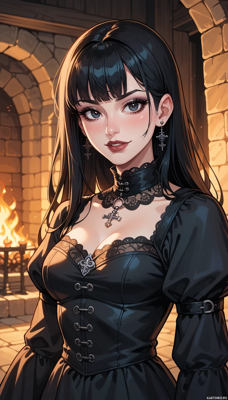 На картинке запечатлена молодая женщина с длинными темными волосами и челкой, одетая в черное платье с кружевным вырезом и крестик на шее. На заднем плане виден каменный камин с горящим огнем, что создает ощущение уюта и деревенского стиля.