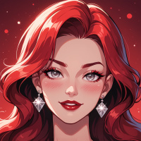 subtle blush on her cheeks adds a touch of warmth to her complexion. **Attire:** * She wears a low-cut, revealing top that exposes her cleavage, drawing attention to her curves. * The top's design is not fully visible, but it appears to be made of a shiny material, possibly satin or silk. * A pair of dangling earrings adorns her ears, shaped like diamonds and featuring a sparkling gemstone at their center. **Background:** * The background of the image is a deep red color, which complements the woman's hair and adds to the overall sense of drama and intensity. * White dots are scattered throughout the background, giving it a slightly starry or celestial feel. Overall, the image presents a captivating portrait of a confident and alluring woman with striking features and bold fashion choices.