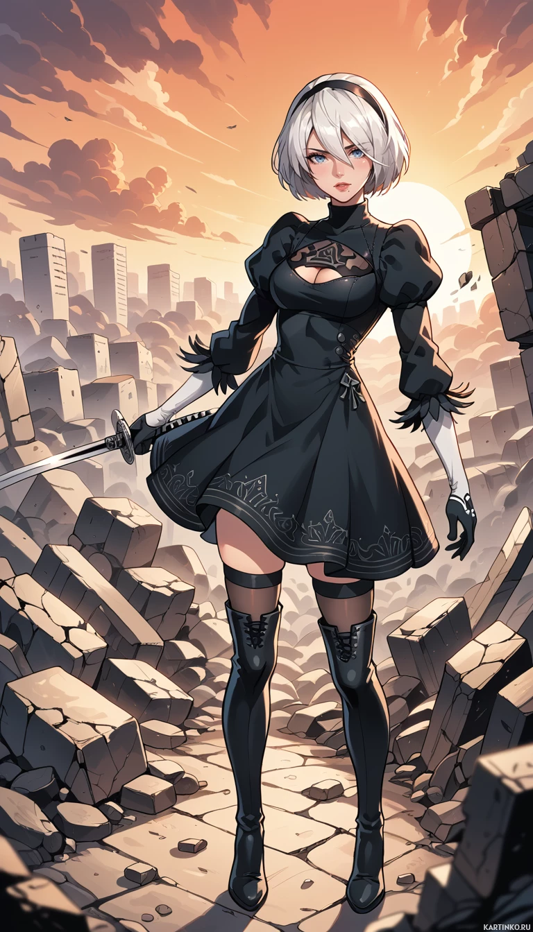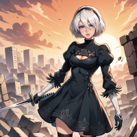 dark clouds that add to the overall sense of desolation and decay. Overall, the image presents a striking contrast between the character's elegant attire and the devastated urban environment she inhabits. The character's pose and expression convey a sense of determination and resilience in the face of adversity, as if she is ready to take on whatever challenges come her way. The sword in her hand serves as a symbol of her strength and preparedness for battle, while her surroundings evoke a sense of post-apocalyptic desolation and struggle. The image's color palette is notable, with shades of gray, white, and black dominating the scene. The orange sky adds a pop of warmth to an otherwise somber atmosphere, creating a visually striking contrast that draws the viewer's eye.