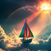 The image depicts a serene and idyllic scene, with a sailboat floating on
