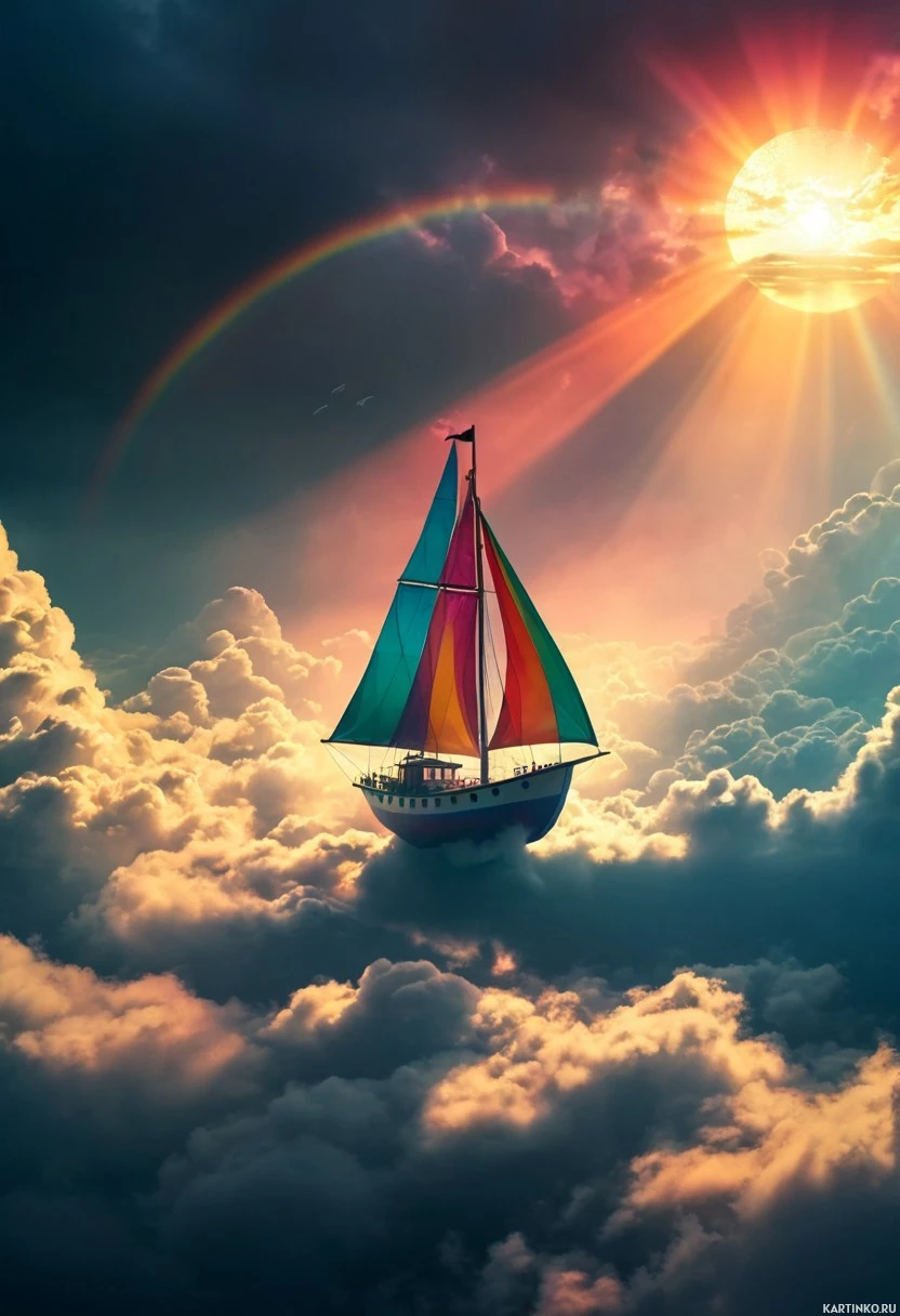 a sea of clouds. The boat is positioned centrally in the frame, its sails billowing in the wind as it glides effortlessly through the air. The sky above is a brilliant blue, dotted with puffy