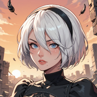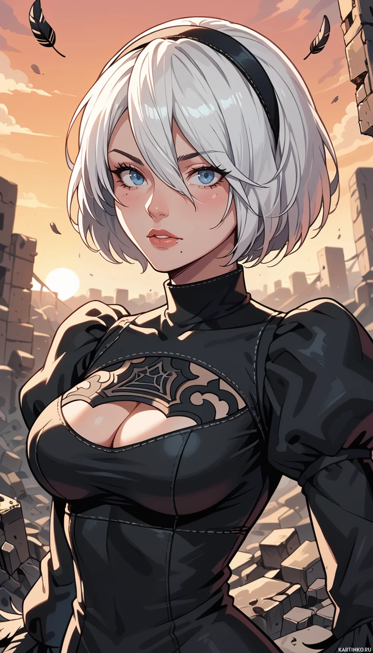 white hair and blue eyes, wearing a black dress. The background of the image is orange, suggesting that it may be a sunset or sunrise. * The woman has short, straight white hair that falls just below her shoulders. * Her hair is parted in the middle, framing her face. * She has