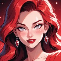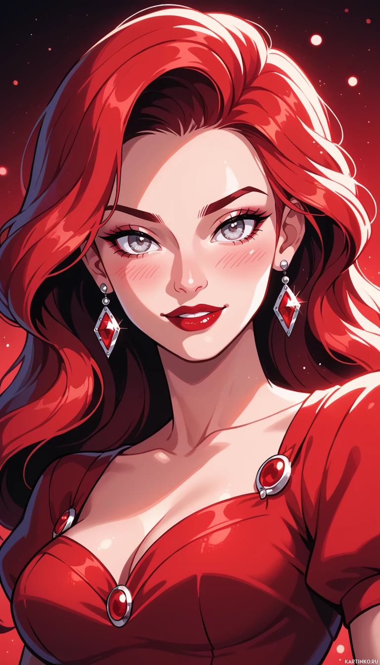 metallic material that catches the light. The garment features a deep V-neckline and a low-cut back, accentuating her curves. A pair of dangling earrings adds a touch of glamour to her overall look. The background of the image is a deep, rich red hue, which complements the woman's fiery locks perfectly. The color scheme is bold and vibrant, drawing the viewer's eye to the subject. Overall, the illustration exudes a sense of confidence and sophistication, making it an appealing and captivating visual representation.