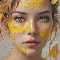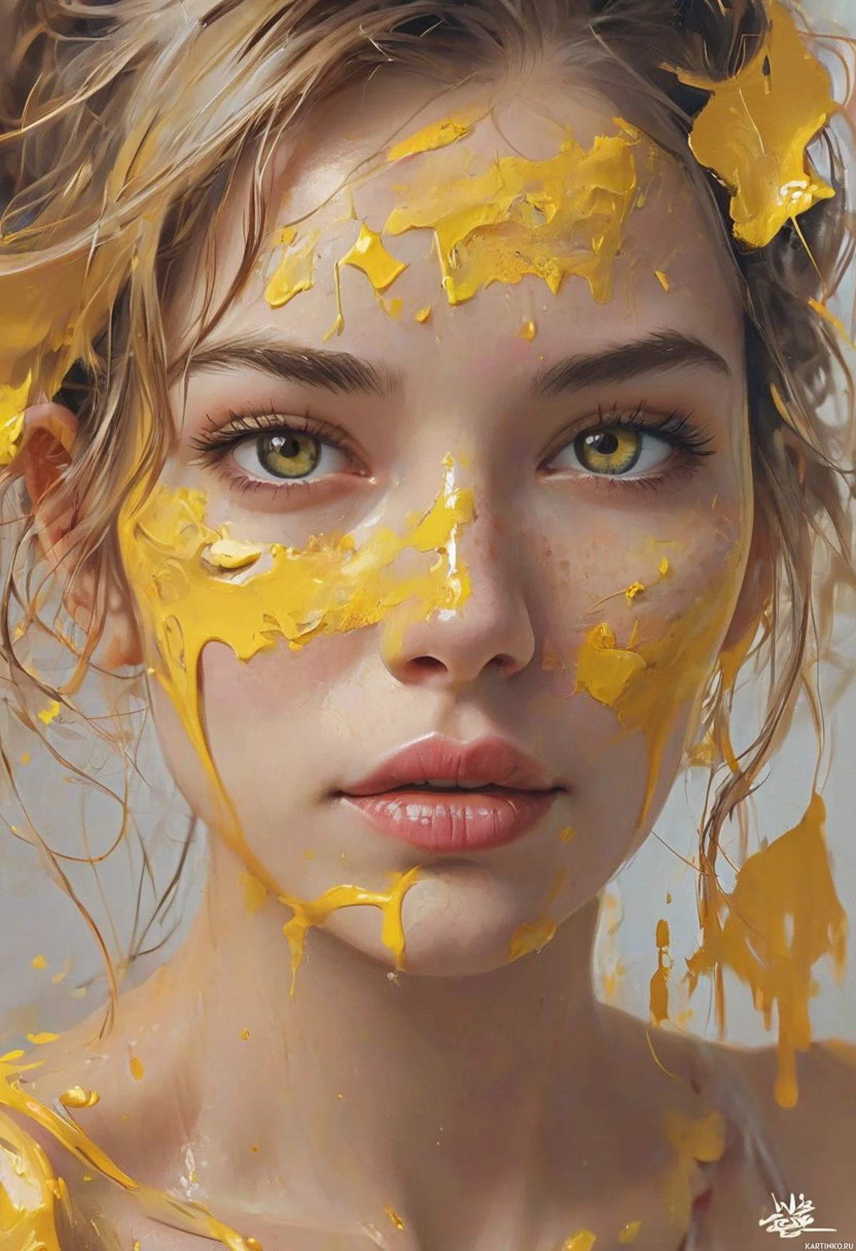 The image features a woman with golden, sticky paint smeared all over her face. She has long eyelashes and large,
