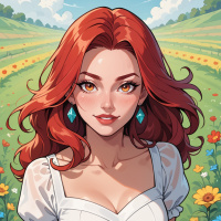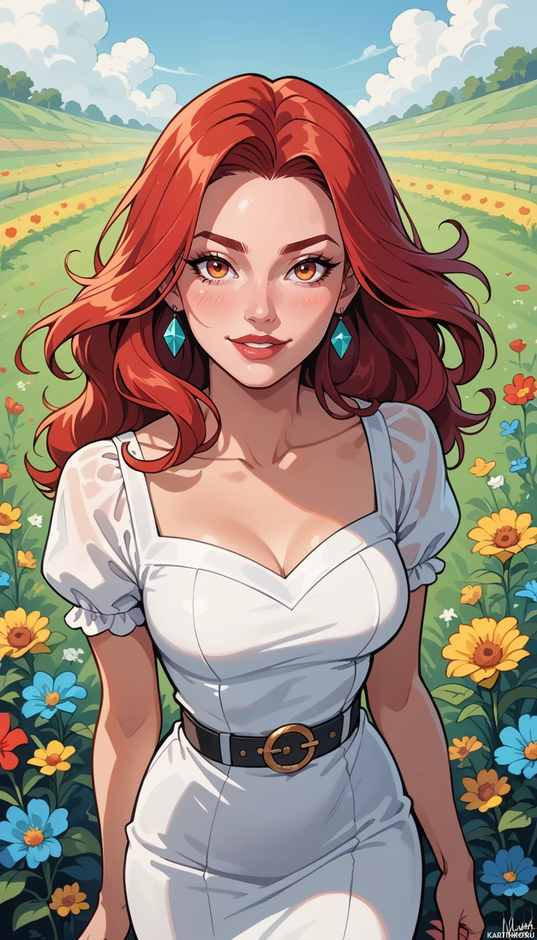 a young woman with long, wavy red hair and large brown eyes. She is wearing
