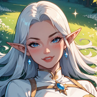 blue eyes sparkle like sapphires in the sunlight, and her rosy cheeks add to her ethereal beauty. The elf is dressed in an elegant
