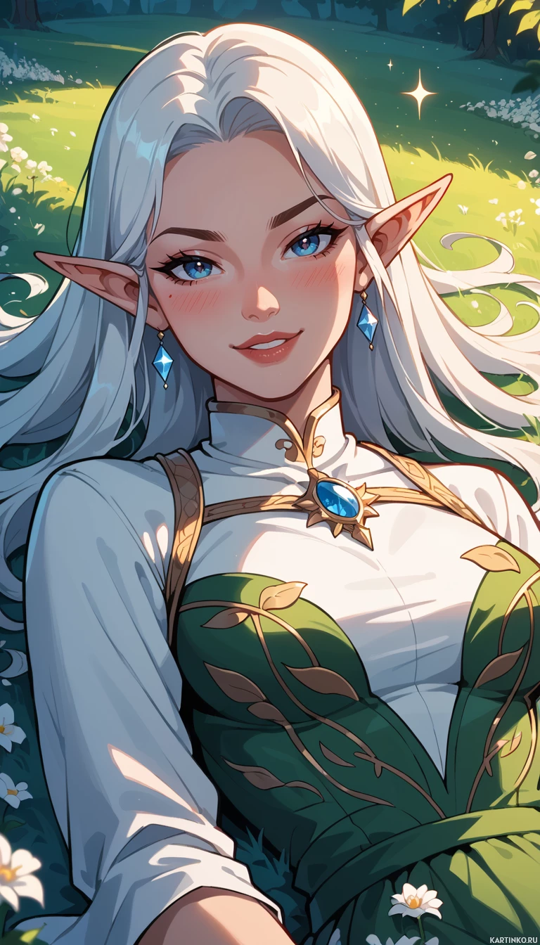 an elf woman lying on her back in a lush green field, surrounded by white flowers. The elf's long, flowing white