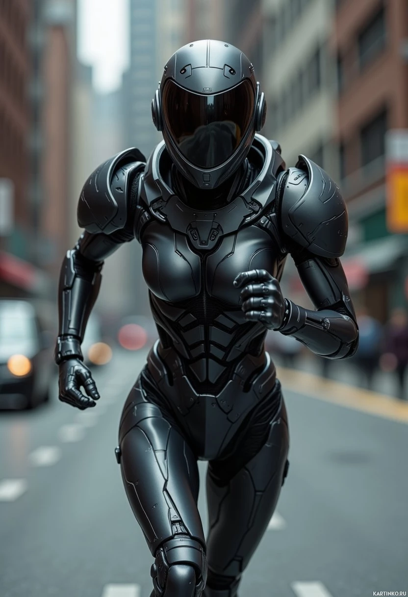 a distinctive helmet with a visor that covers her face, giving her an otherworldly appearance. The background of the image is blurred, but it appears to be a city street lined with