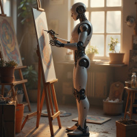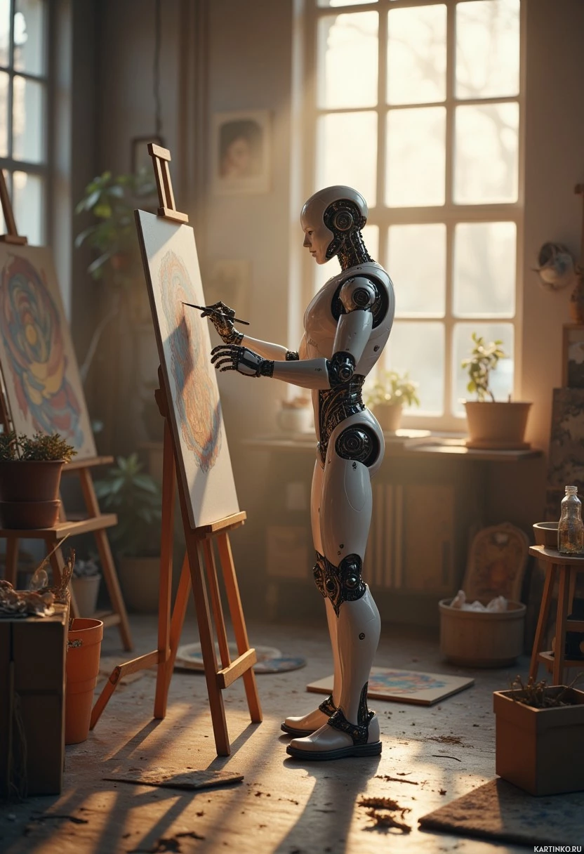 a humanoid robot, resembling a human, stands in an art studio. The robot is engaged in painting on a canvas, its