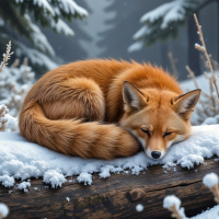 a red fox curled up and sleeping on a snow-covered log. The fox's fur is a vibrant