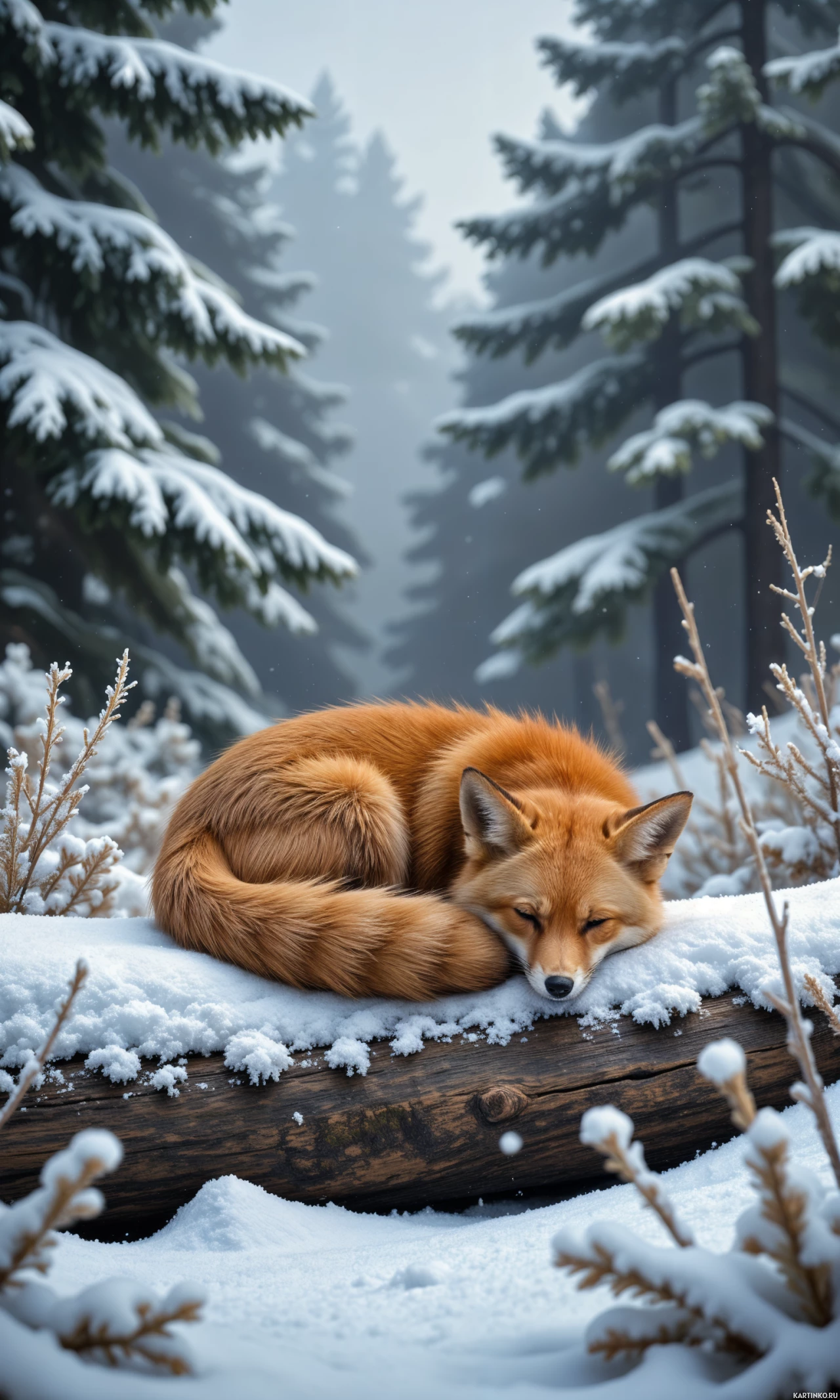 the snowy forest. The log, which serves as the fox's bed, is covered with