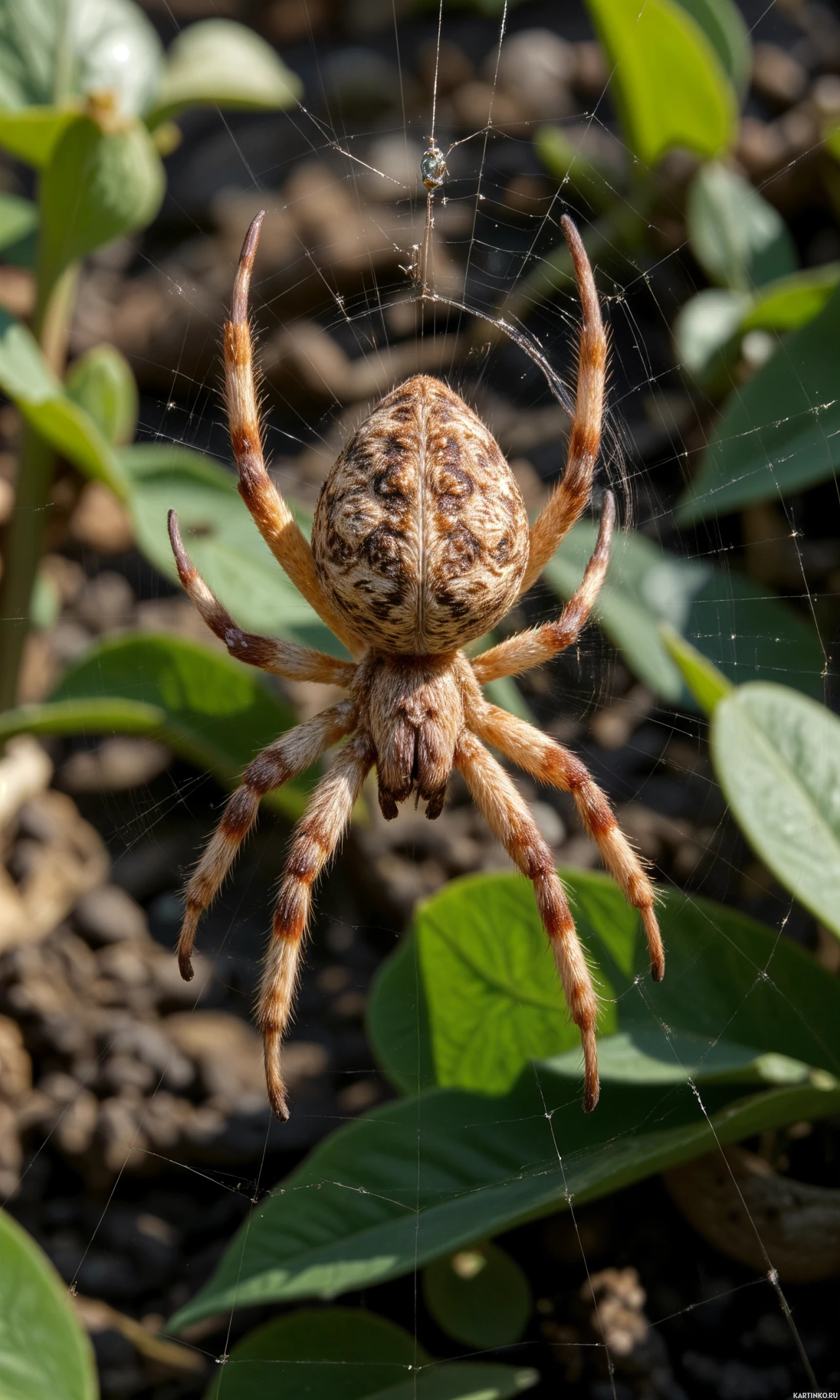 natural habitat. The spider is positioned centrally, with its body facing downwards and its legs splayed outwards. It has a brownish-