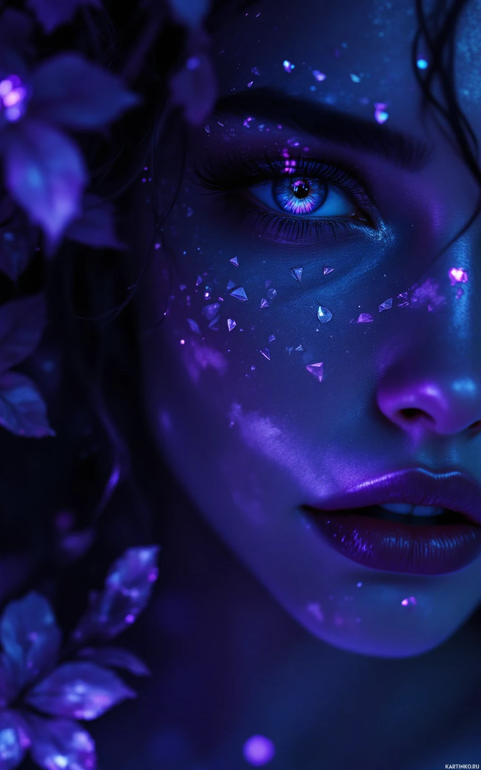 natural beauty. The woman's gaze is piercing, as if she is seeing into the very soul of the viewer. The image is bathed in a soft, blue-purple light that casts