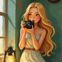 a white dress adorned with small orange flowers and has green eyes that sparkle as she focuses her attention on the camera's viewfinder. To her left stands an old-fashioned lantern, emitting a warm yellow glow from within its