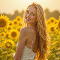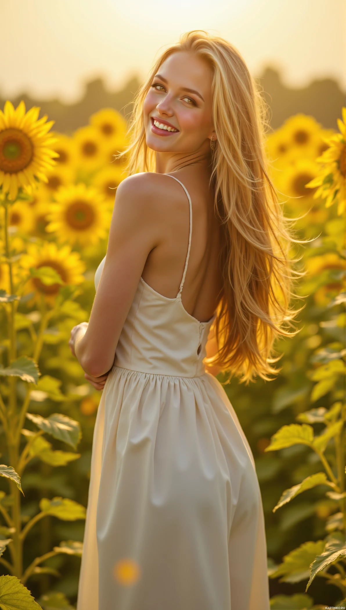 a young woman with long, blonde hair and a white dress standing in a field of sunflowers. The woman is facing away from the camera, but she turns her head to smile at the viewer. She has a slender build and wears a sleeveless