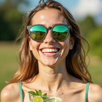 a young woman with long brown hair, wearing sunglasses and a green tank top. She is smiling widely, revealing her teeth, and holding a glass of