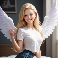 an open book, although it's not clear if she is holding it or simply resting near it. The image has been edited to exaggerate certain features and give the character angelic wings.