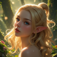 blue eyes sparkle as she gazes into the distance, her slender neck accentuating her ethereal appearance. The background of the image is blurred, but it appears to be a forest setting with