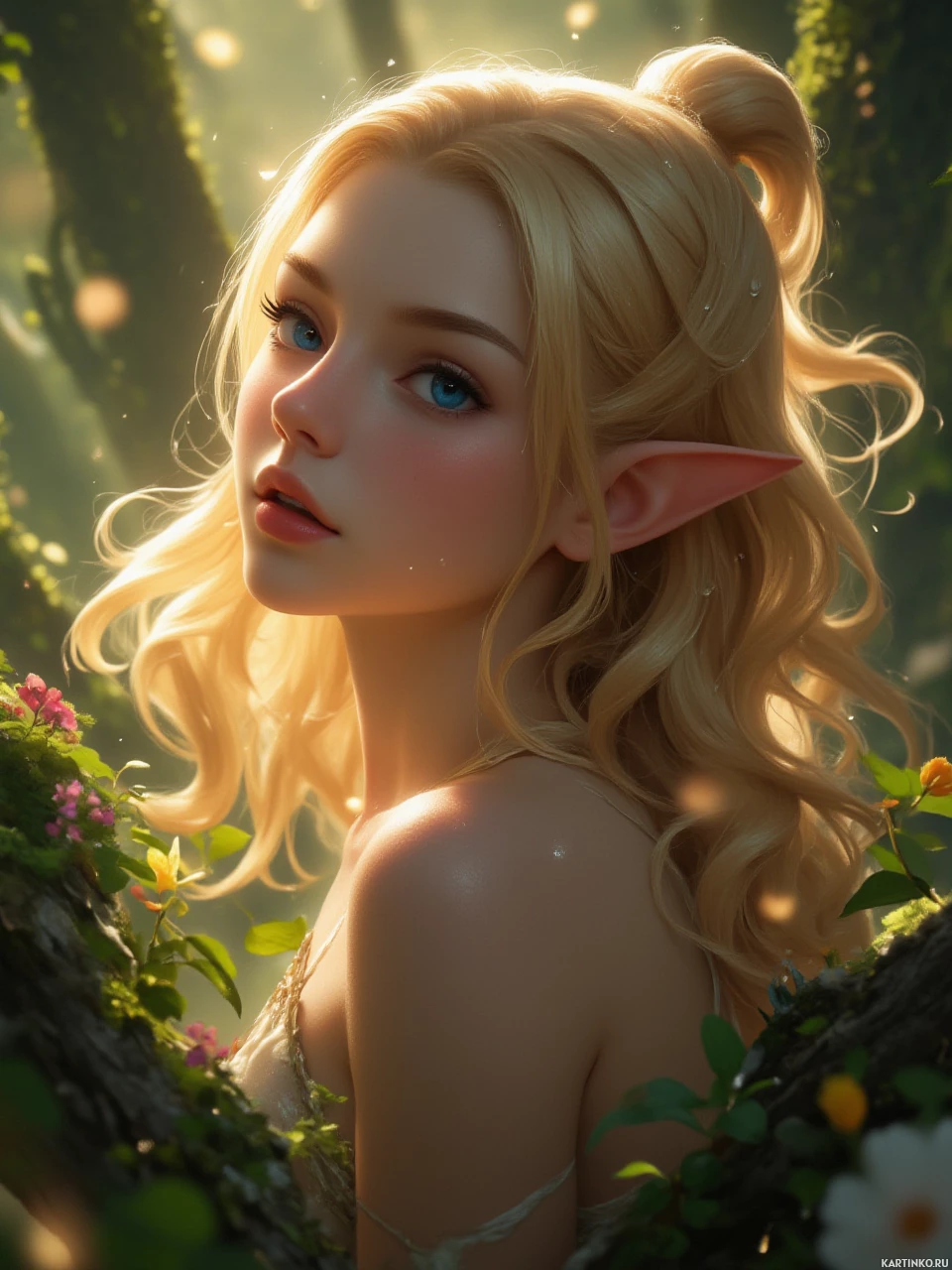 This image showcases a captivating fantasy illustration of an elf-like woman with striking features. Her