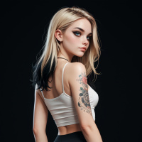 several tattoos, including a large rose on her upper arm. The background of the image is solid black, suggesting that it may be a product photo or