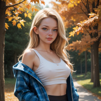 a forest scene with trees and bushes. * **Woman** * Age: 20-30 years old * Hair color: Blonde * Hair length: Long * Eye color: Blue * Skin tone: Fair * Clothing: * Top: White tank top * Bottoms: Green shorts * Footwear: Brown boots * **Background** * Forest scene with trees and bushes * Sunlight filtering through the leaves * A path or trail leading into the forest The image appears to be