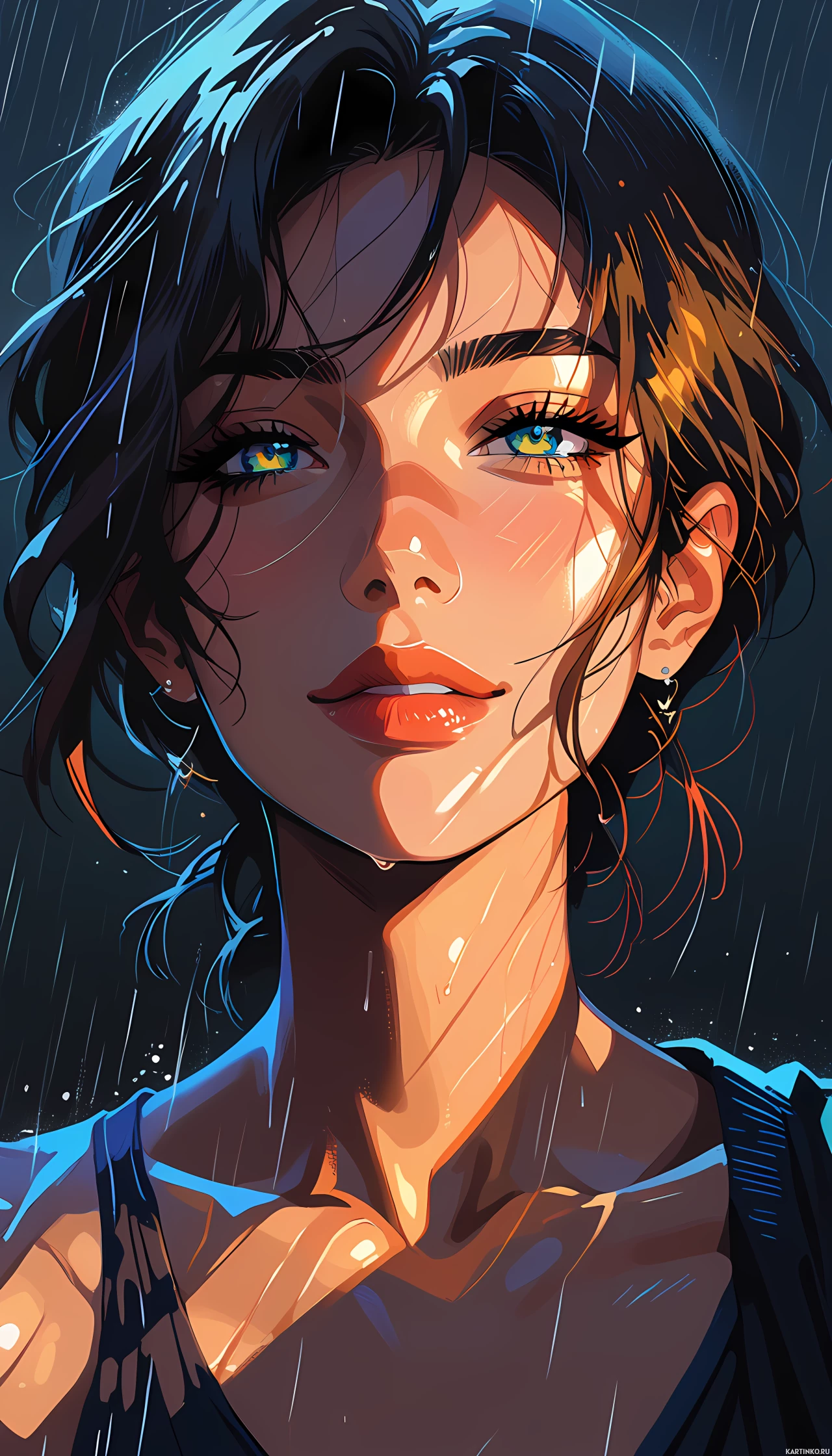 a black shirt or dress that exposes her shoulders, suggesting it may be lightweight or sleeveless. In the background, rain pours down on her, creating