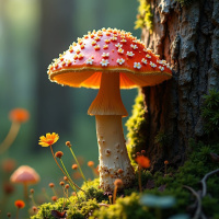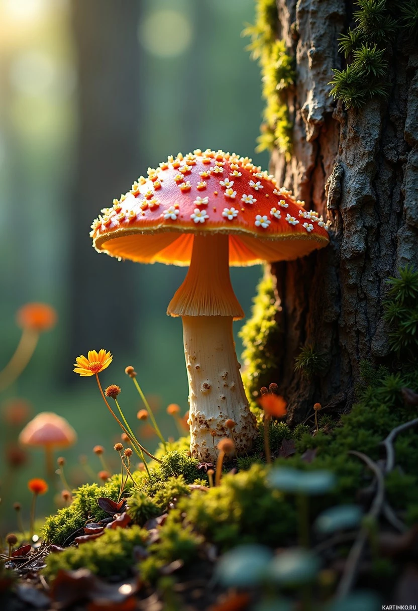 forest scene, featuring a vibrant red mushroom with white spots as its central focus. The mushroom's cap is adorned with small, delicate flowers and is situated near the base of