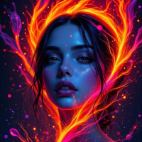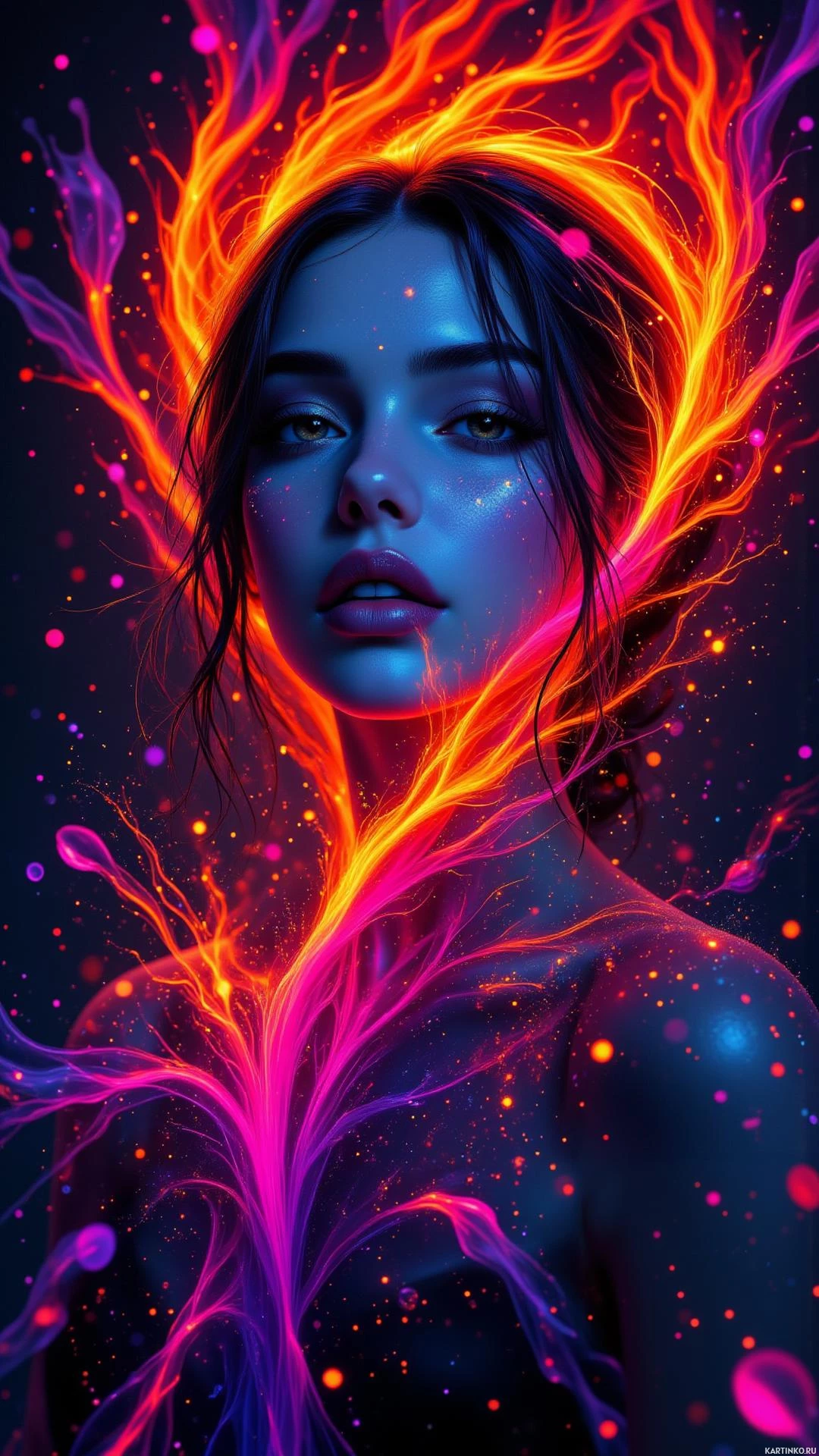 the vibrant hues of the woman's aura. The woman has long, flowing black hair that cascades down her back in
