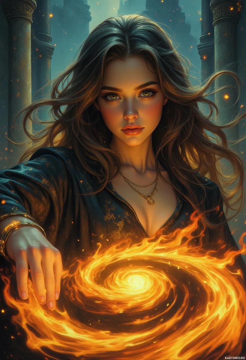 a mesmerizing pattern. The background of the image is shrouded in mist or smoke, which obscures any details beyond the woman and the flame vortex. However, it seems to suggest an ancient,