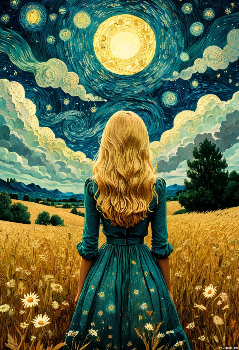 blonde hair, wearing a teal dress and standing in a field of yellow flowers, gazing out at a cloudy sky. The sky is dark blue and features