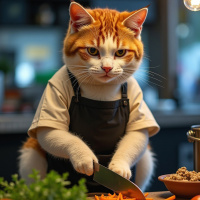 kitchen tools. * The cat is standing at a wooden kitchen counter, surrounded by various ingredients and cooking utensils. * There are tomatoes, carrots, onions, garlic, and herbs scattered across the counter. * A large knife lies on its side next to the cat's paws. * A bowl of ground meat sits on the far right edge of the counter. The overall atmosphere suggests that the cat is preparing a meal for itself or someone else. The presence of various ingredients and cooking utensils implies that the cat has some experience with cooking, but its concentration on cutting the carrots suggests it may still be learning.