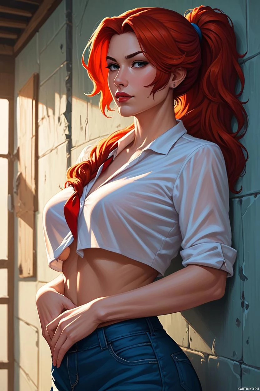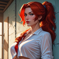 expressive eyes, and her complexion is fair. The character is wearing a white button-up shirt partially unbuttoned to reveal a hint of cleavage, paired with