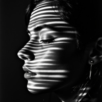 a black top, and there are vertical blinds casting light and shadow across their face. The overall mood of the picture seems introspective and reflective. The use of light and shadow creates