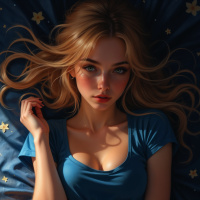 The image features a young woman with long, flowing blonde hair and piercing green eyes. She is dressed in a blue shirt that has been tied at her waist, revealing her toned midriff. Her skin appears smooth and luminous, suggesting she may have undergone some form of photo editing or retouching. The overall effect of the image is one of natural beauty and effortless style.