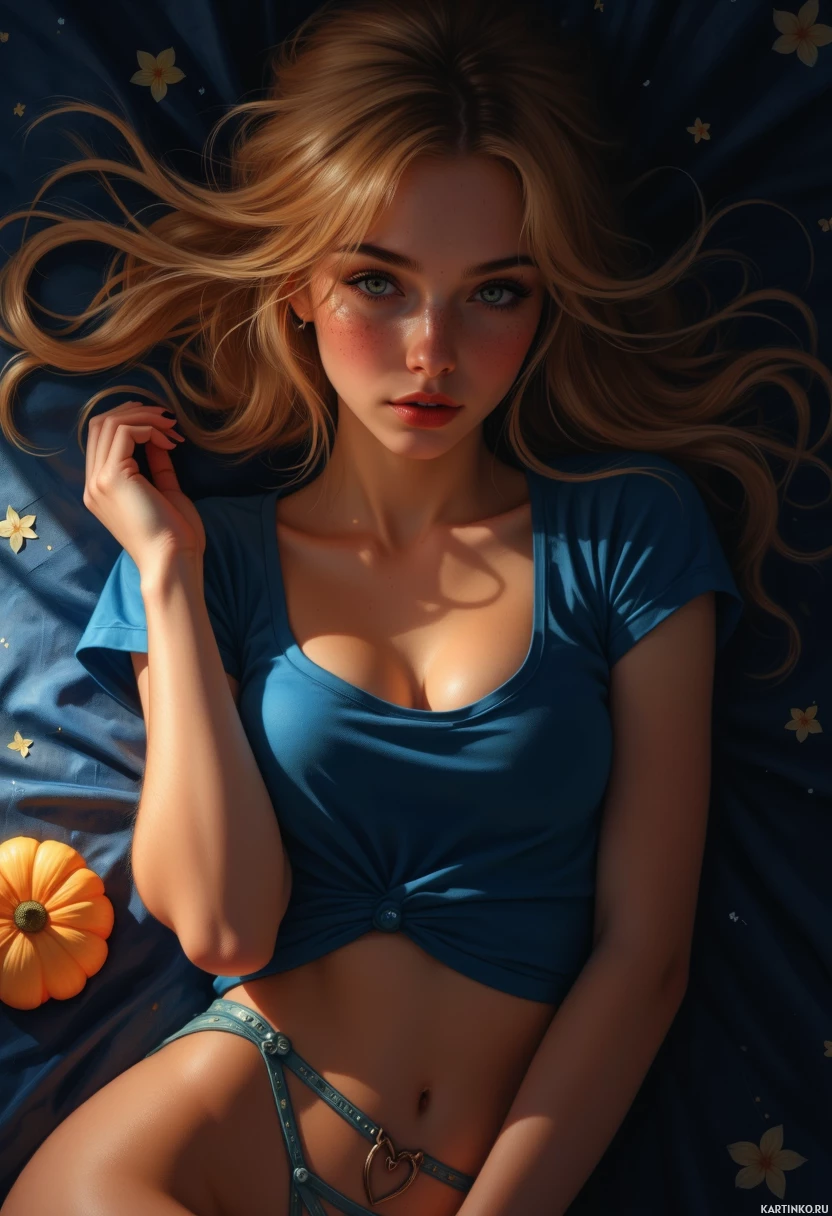 На картинке запечатлена молодая женщина с длинными, струящимися светлыми волосами и пронзительными зелеными глазами. На ней голубая рубашка, завязанная на талии, демонстрирующая подтянутый живот. Кожа выглядит гладкой и сияющей, что может говорить о некоторой ретуши. Общее впечатление от картинки – естественная красота и непринужденный стиль.